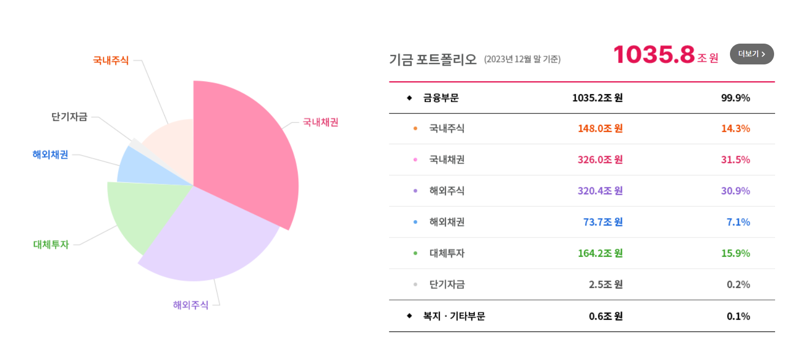 2023年国民年金基金決算結果、基金純資産は1,035兆8千億ウォン('23年末)であり、2022年対比約145兆ウォン増加した。
