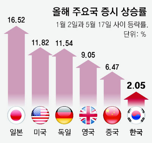 世界的に記録的な強気相場が繰り広げられている一方、韓国株式市場は相対的に低迷している。韓国総合株価指数(コスピ)は、主要7ヵ国(G7)と中国、インドなど10ヵ国の指数のうち、今年に入って最も低い上昇率を記録した。日本の日経225が16.25%で最も多く上昇し、イタリアのFTSE MIB(15.97%)と米国のダウ指数(11.82%)、ドイツのDAX(11.54%)の順だった。一方、コスピは2.05%の上昇に止まった。