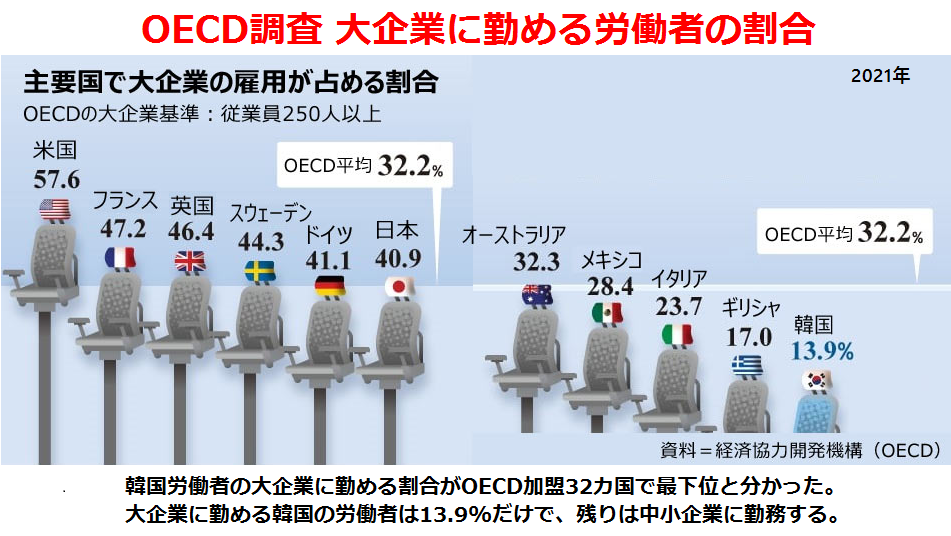 "報告書によると2021年の韓国の従業員250人以上の企業の雇用の割合は13.9%で、関連統計がある経済協力開発機構(OECD)加盟32カ国のうち最も低いことがわかった。大企業が雇用全体で占める割合をみると、OECD平均は32.2%だ。韓国は主に従業員300人を基準として大企業と中小企業を区分するが、OECDは250人を基準とする。"