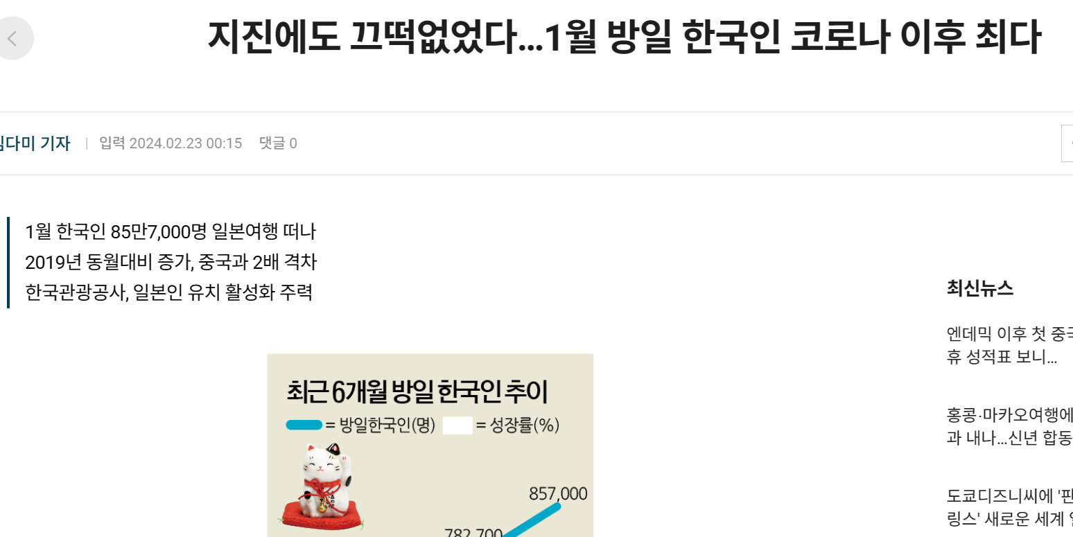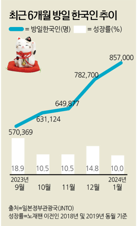 " 1月だけで85万7000人の韓国人が日本を訪れたが、これは2018年(月基準80万3816人)以降「歴代最多」記録だ。"