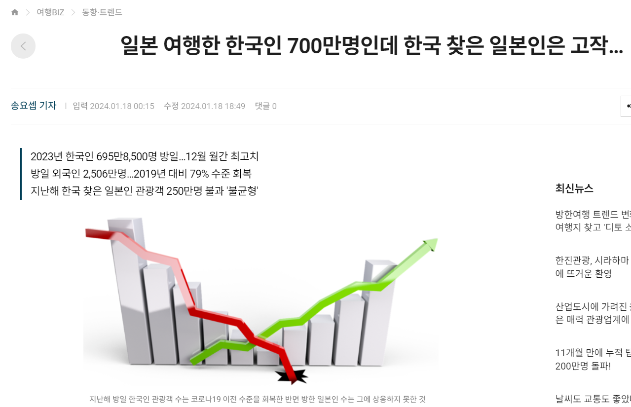 出入国人口だけでなく、支出の差も原因として指摘されている。 韓国銀行のカード使用実績統計によると、外国人観光客(非居住者)が昨年国内で使ったカード価格は95億3700万ドルと集計された。 同期間、韓国人の海外消費額は192億2000万ドルだった。 外国人の国内消費の2倍を超える。このような問題を意識して政府が昨年12月初めに「大韓民国観光輸出革新戦略」を出したが、効果はまだ疑問符だ。