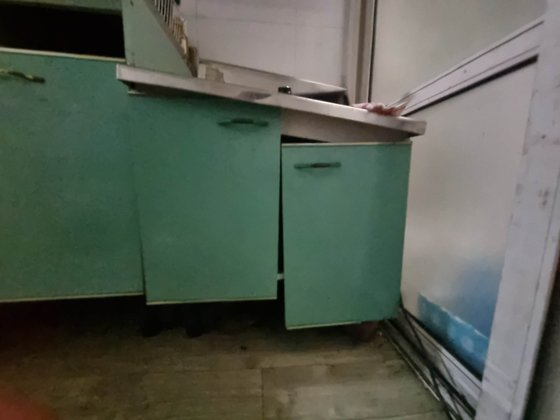 公開された宿舎の状態は湿気によって壁紙がすべて取れてない状態だった。ホコリがたまり、ぼんやりと灯っている電灯とくすんだシンク台があった。
