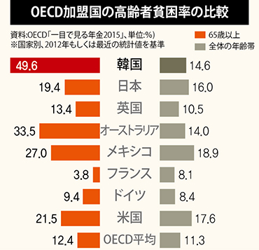 一人暮らしの高齢者の貧困率は70.3%に達した。最後のセーフティーネットである国民基礎生活保障制度(生活保護)による生計給与、基礎年金(高齢者のうち所得下位70%の人に支給)、国民年金などを加えていない市場所得だけを見れば、高齢者の単身世帯の貧困率は88.9%。