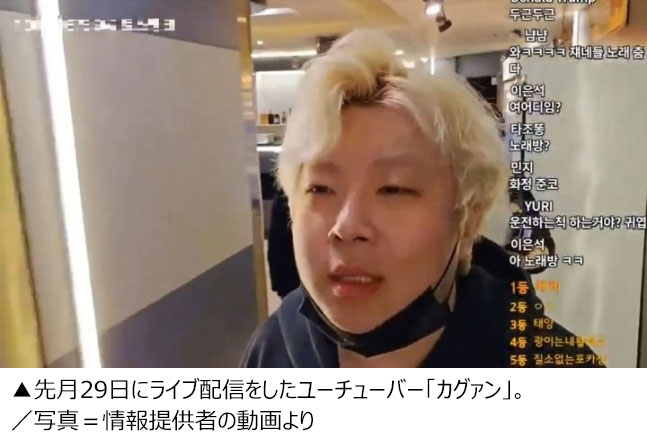 4日の動画共有サイト「ユーチューブ」などによると、これは、ユーチューバーの「カグァン(kagwang)」=本名:イ・サンイル(28)=が先月29日のライブ配信で、「今は週末に入る12時(午前0時)過ぎだから休日(料金)」とカラオケ店員に言われた時に発言したものだ。