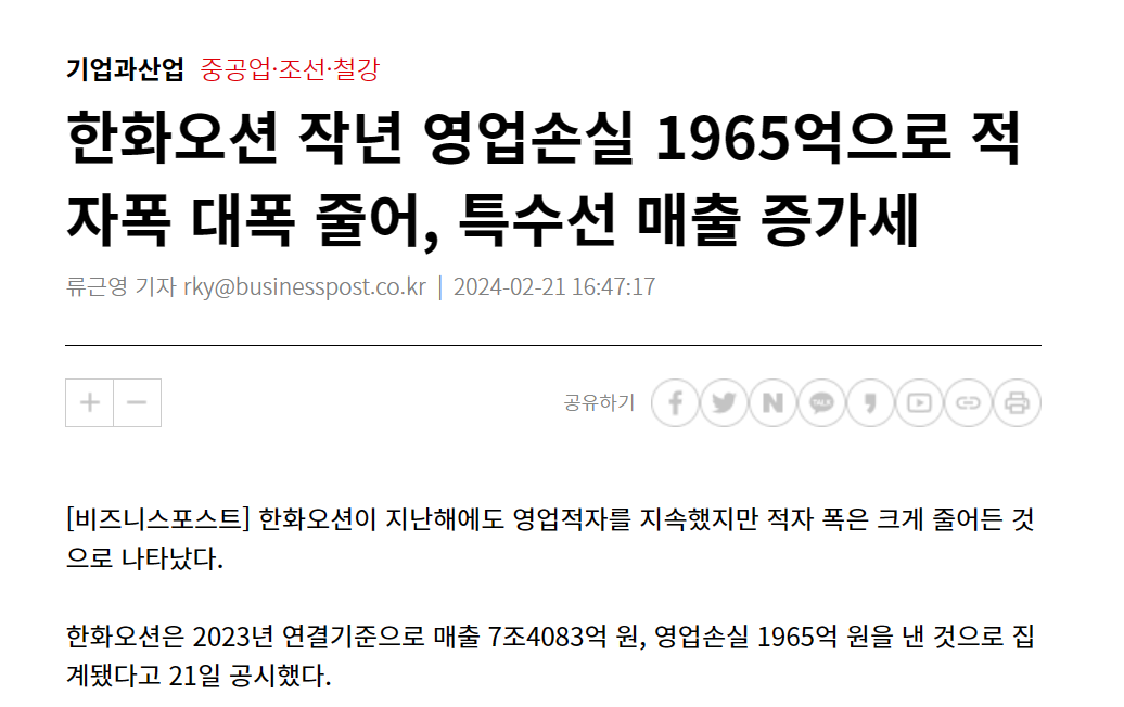 ハンファオーシャン(旧:大宇造船海洋)、昨年の営業損失は1965億ウォン