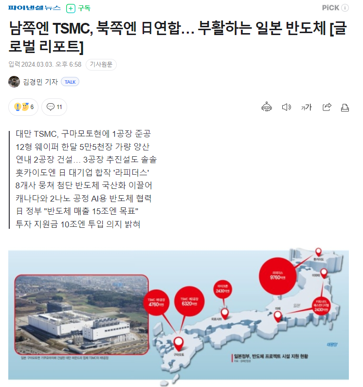 一方、TSMCは先月24日に日本で熊本第1工場開所式を開いた。日本はTSMC第1工場設備投資額の半分近い最大4760億円の補助金を提供することにした。熊本県菊陽町に建設されたTSMC第1工場では12~28ナノ工程製品を1カ月に約5万5000枚(300ミリメートルウエハー基準)生産する予定だ。TSMCは年内に熊本県に第2工場建設も始める予定という。
