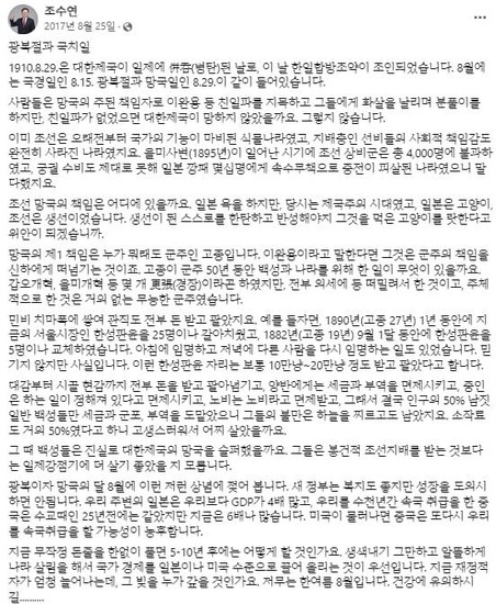 13日の政界によるとチョ氏は2017年8月25日にフェイスブックを通じ「人々は亡国の主な責任者として李完用ら親日派を名指しし彼らに矢を放って鬱憤を晴らすが、親日派がいなかったら大韓帝国は滅びなかったでしょうか。そうではありません」と主張した。チョ氏は「すでに朝鮮はかなり前から国の機能がまひした植物国」と書いた。