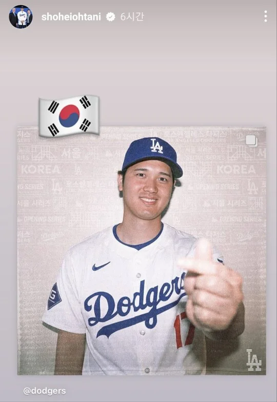 世界的な野球選手大谷翔平の公式インスタグラムアカウントに13日午前、太極旗とともに指ハートをする彼の写真が上げられた。ちょうど1週間先の20日にソウルの高尺(コチョク)スカイドームで開かれる予定である大リーグ(MLB)開幕戦を念頭に置いた写真だ。所属チームのLAドジャースのアカウントもタグ付けした。