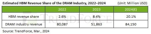 TrendForceは、HBMの高いASPと収益性により、メモリ部門に相当な資本投資が行われたと報告しています。 Avril Wu首席副社長は2024年末までにDRAM業界が総容量の約250K/m(14%)をHBM TSV生産に割り当てると予想し、年間供給ビット増加率は約260%に達すると予想します。 また、ディーラム業界におけるHBMの売上シェア(2023年は約8.4%)は2024年末までに20.1%に増加すると予想されます。