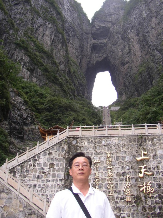 「天門山の象徴である上天梯を登る」って韓国語で説明が書いてある写真。