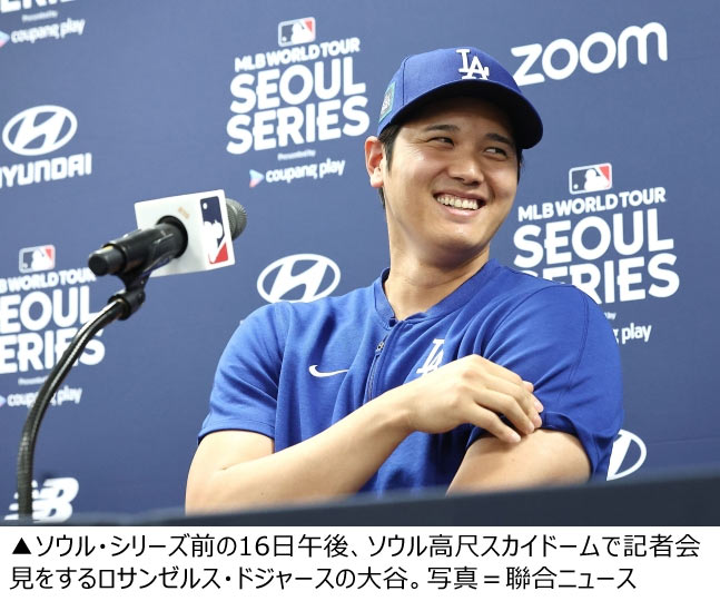 大谷は16日、ソウル高尺スカイドームで行われたドジャースの自主練習と記者会見に出た際、米大リーグ(MLB)公式開幕2連戦「2024 MLBワールドツアー・ソウル・シリーズ」ドジャース対サンディエゴ・パドレス戦について、「韓国でプレーできるのは楽しみ」「野球自体も韓国自体も楽しんで頑張りたい」と語った。そして、12年前に高校野球の国際大会「AAA世界野球選手権大会」に日本代表として出場するため韓国に来たことに関しては「あの時から(韓国は)好きな国の一つなので」「また野球で帰ってこれてプレーするのは自分の中では特別かなと思っている」と答えた。