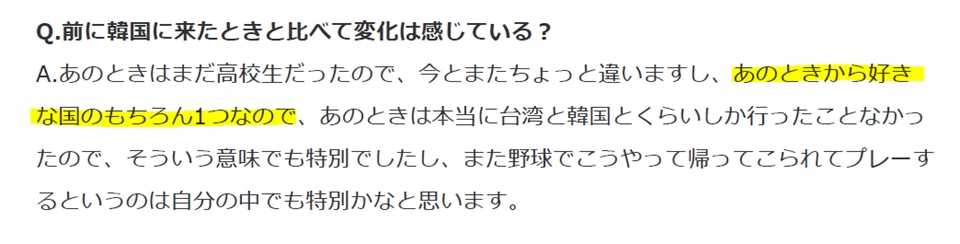 「高校時代にも日本代表選手として韓国に来たことがある。あの時は高校生だったが、今はプロ選手としてまた韓国にやってきた。野球が好きな国として、自分も好きな国の1つだ。韓国で野球をプレーできることが嬉しく思う」という趣旨のコメントを、勝手に脳内お花畑に作り変えたのを勘違いして建てられのが、この1のスレ内容ですね。