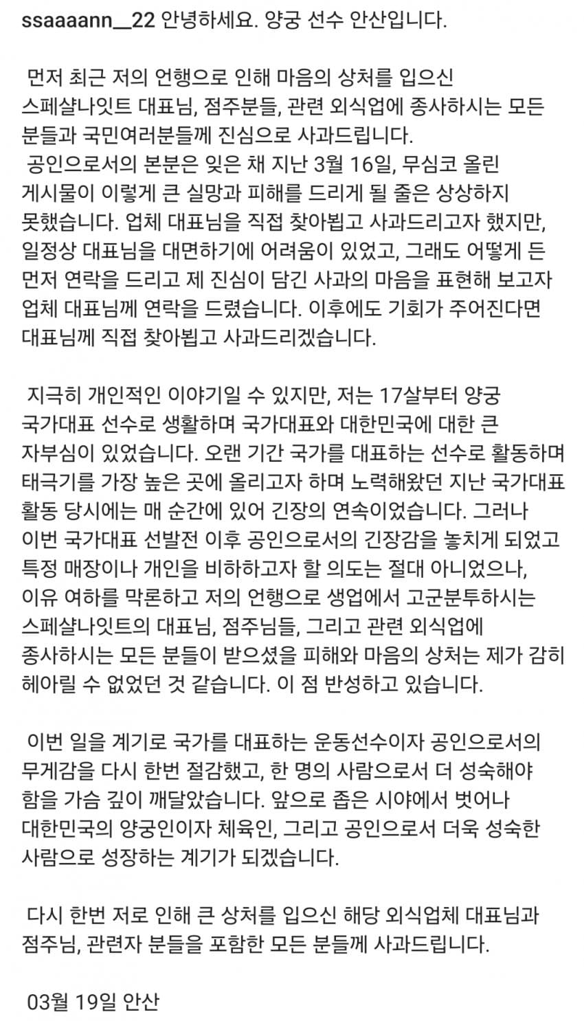 東京五輪で三つの金メダルを獲得したアーチェリー韓国代表、安山(アン・サン)選手が日本風居酒屋チェーン店を「売国奴」呼ばわりしたことについて、「公人としての本分を忘れてよく考えずに掲載した投稿が大きな失望と被害をもたらすとは思いもよりませんでした」と謝罪した。これは「売国奴」関連の投稿をしてから三日を経ての謝罪だ。