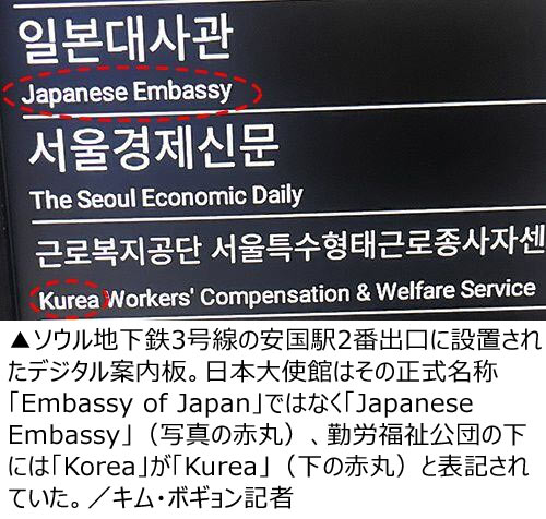 類型別では企業や政府機関などの正式名称を無視したケースが62件と最も多かった。日本大使館は正式名称が「Embassy of Japan」だが、安国駅の案内表示には「Japanese Embassy」と記載されていた。鍾路3街駅では世運商街が「Seun Arcade」とされていたが、正式な英文名称は「Sewoon Plaza」だ。