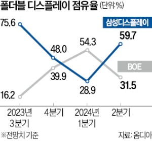 국내 디스플레이업계에선 화웨이의 1분기 폴더블 신형 스마트폰 출시에 맞춰 BOE가 납품량을 늘렸기 때문이란 분석이 나온다. 일시적인 현상일 수 있다는 얘기다. 오는 3분기 폴더블 스마트폰 신제품 출시를 앞둔 삼성전자가 2분기부터 주문을 본격화하면 삼성디스플레이의 재역전은 시간문제란 게 국내 업계의 평가다.