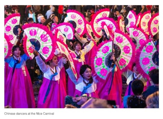 写真によると、フランスのある旅行会社サイトには最近閉幕した世界的なフェスティバル「ニースカーニバル」を紹介する過程で「中国人ダンサー」というキャプションとあわせて扇の舞を踊る写真が掲載された。