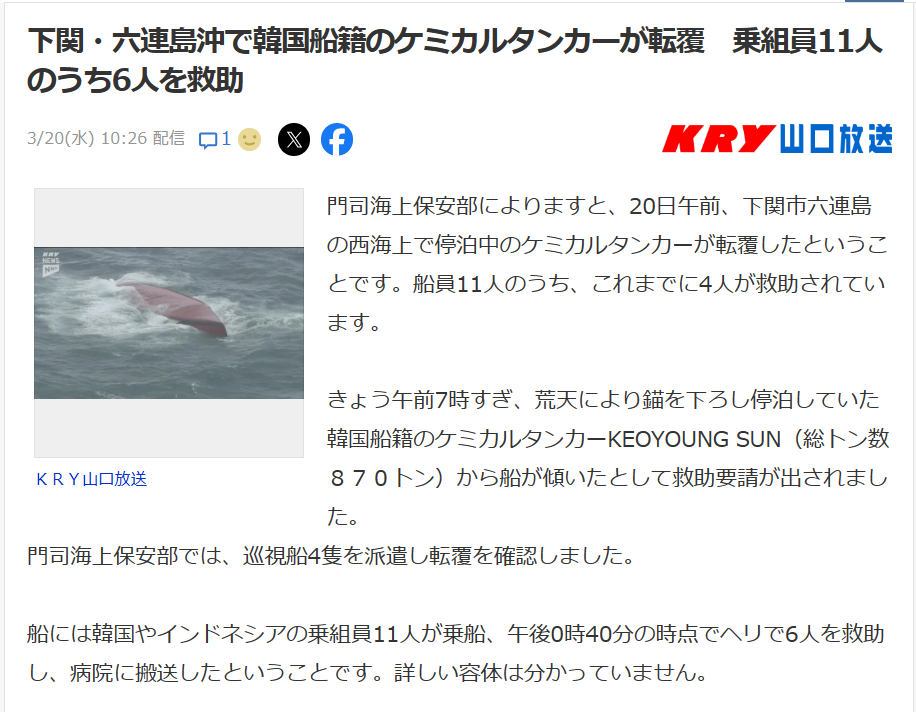 下関・六連島沖で韓国船籍のケミカルタンカーが転覆 乗組員11人のうち6人を救助