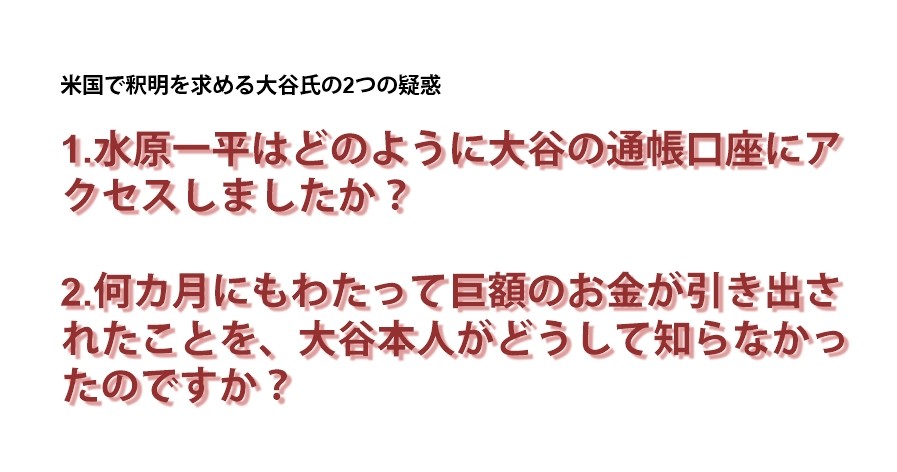 水原氏なら口座にアクセスすることは難しくはないだろう。FBIが、大谷翔平に興味を示さなかった、これの意味するところを考えれば、答えが出るね。