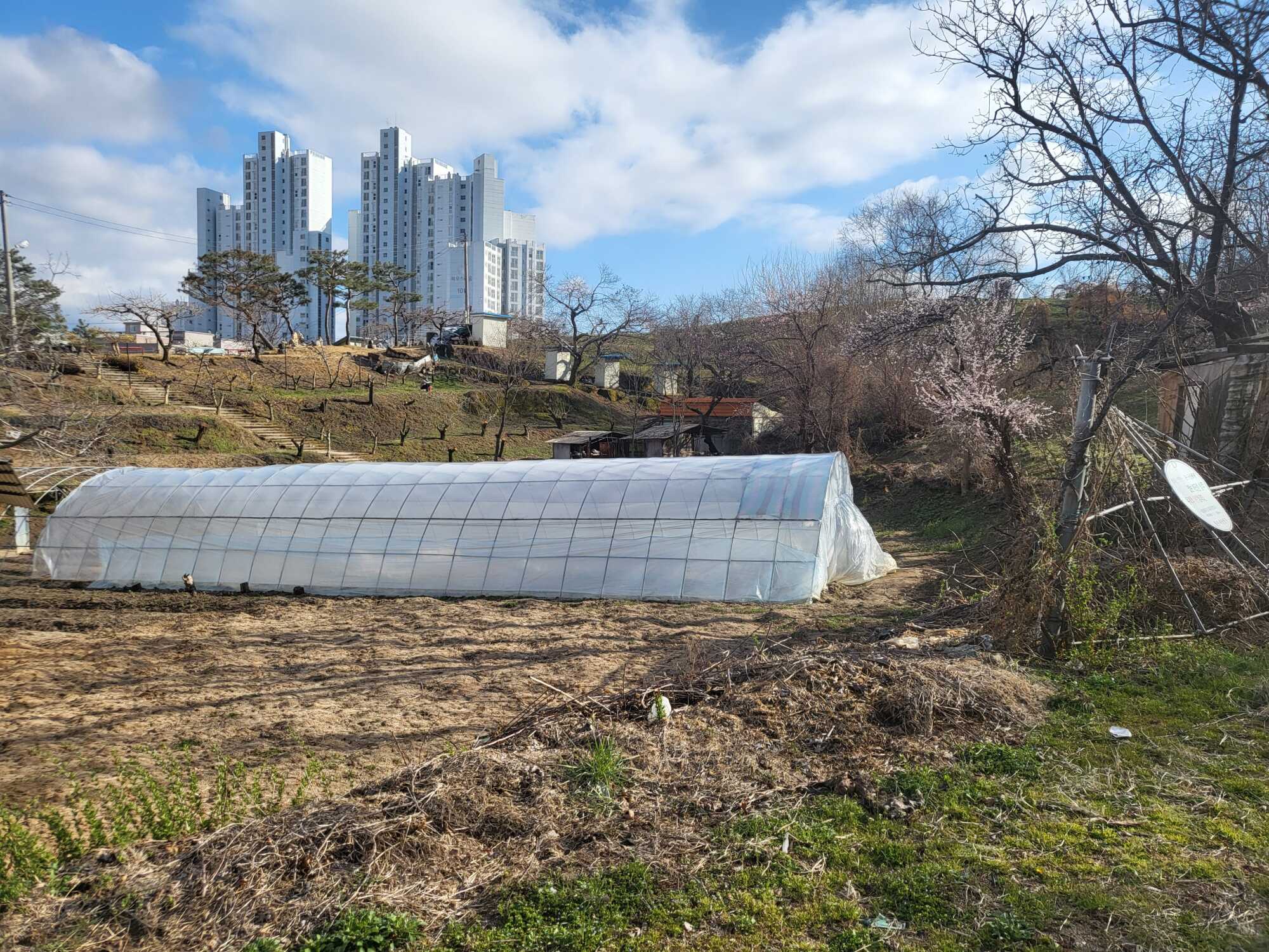 ビニールハウスは接ぎ木の桜苗の大量生産施設。