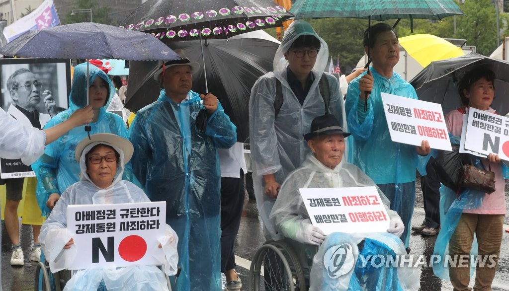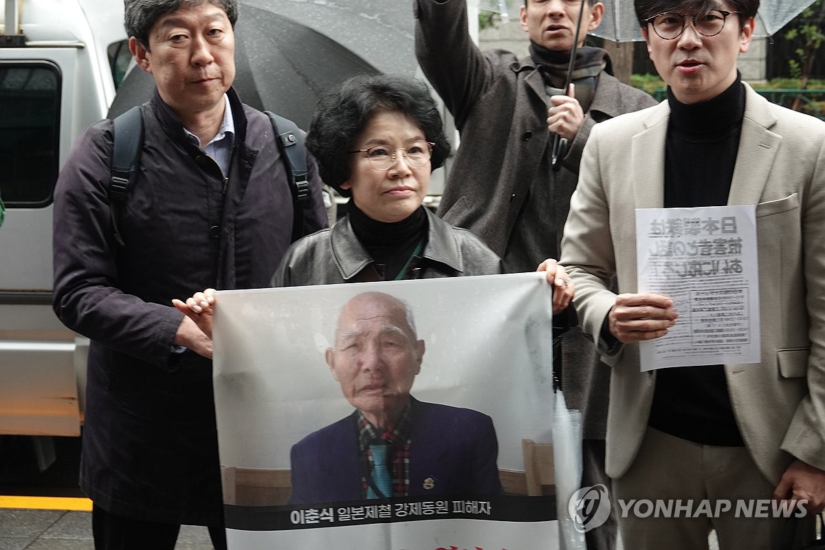 雨が降りしきる中、徴用被害者の家族らは被害者の写真や謝罪・賠償を要求するプラカードを掲げ、抗議した。