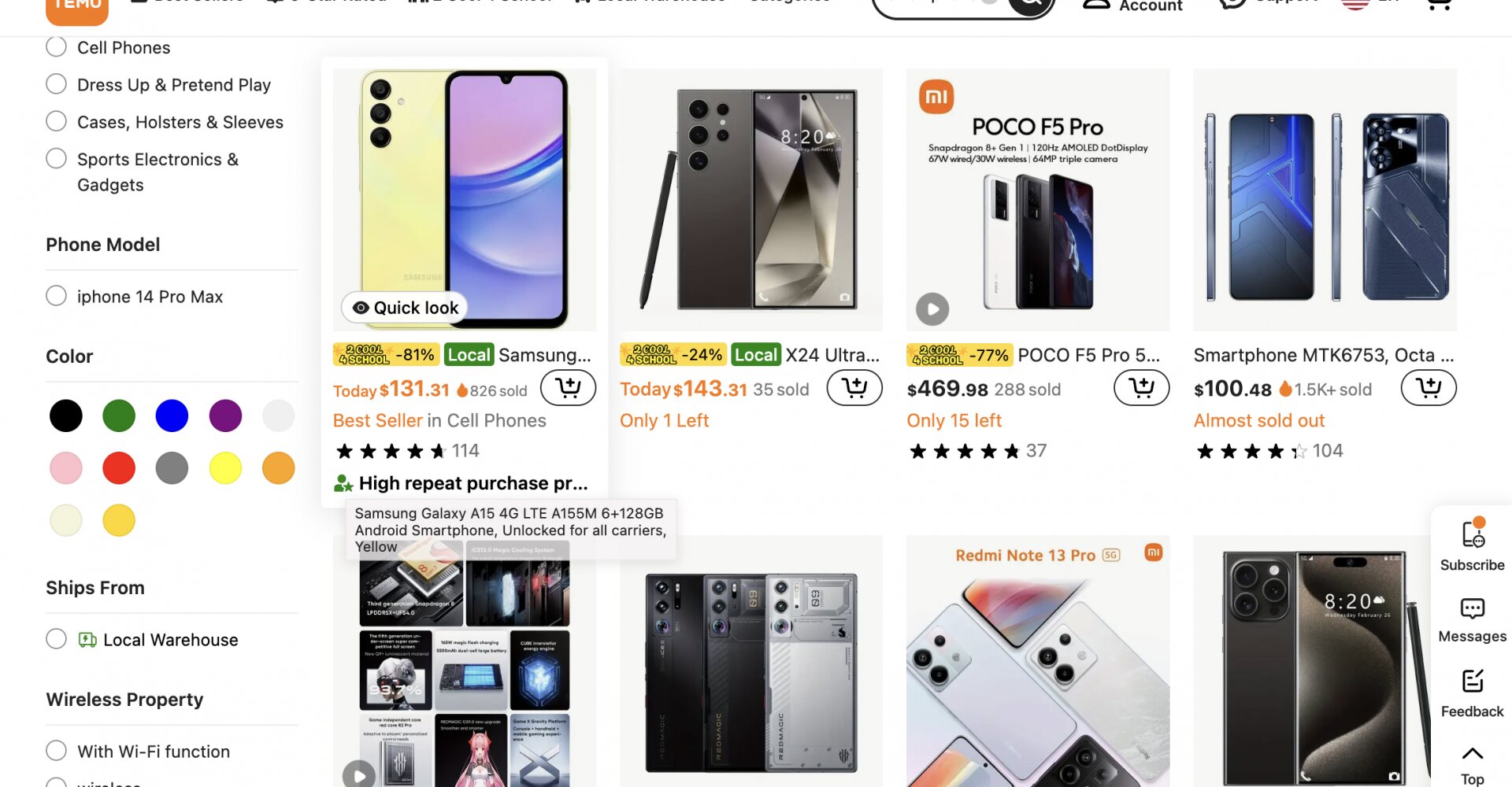 現在のところ、取り扱いブランドは小米(シャオミ)とサムスンが中心となっている。例えば、米国で高い人気を誇るサムスンの「Galaxy A15」(6GB RAM・128GB ROMバージョン)の同一時期の販売価格を比べると、中国の国内向けECサイトが1129元(約2万4000円)、米アマゾンの最低販売価格は144.84ドル(約2万2000円)、Temuは131.48ドル(約2万円)と最も安い価格で提供していた。