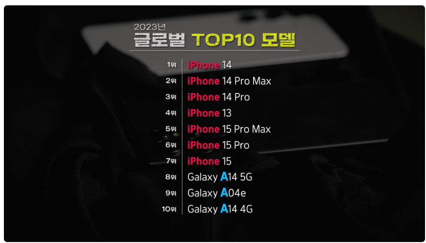 さらに注目すべき点は、アイフォン最新製品15シリーズの位置だ。 昨年第4四半期に発売されたので、たった第1四半期、3ヵ月ほど販売したが、サムスンのすべてのモデルを抜いて5、6、7位を占めた。