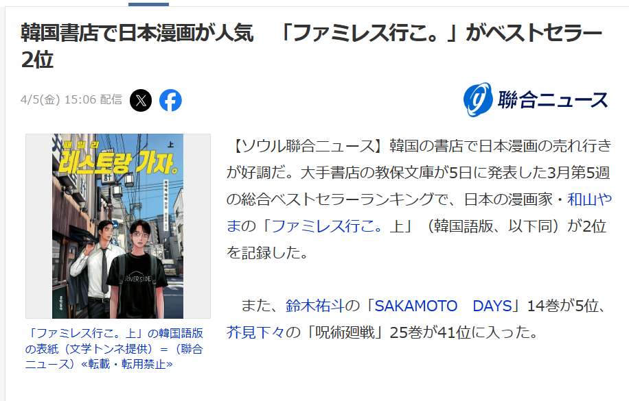 韓国書店で日本漫画が人気 「ファミレス行こ。」がベストセラー2位