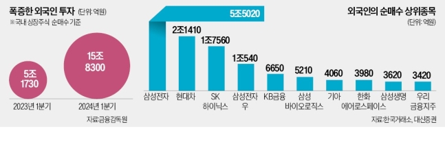 香港とシンガポールを頻繁に行き来するシティグローバルマーケット証券のイ·セチョルリサーチセンター長は最近の外国人投資家の雰囲気をこのように伝えた。 三星(サムスン)電子とSKハイニックスの株価純資産比率(PBR)は1.5倍水準で、米半導体のライバル会社であるマイクロン(3倍)を大きく下回る。 政府の「企業バリューアッププログラム」は韓国半導体企業の低評価魅力を浮き彫りにした。 外国人がサムスン電子とSKハイニックスの株式を今年第1四半期だけで4兆ウォン分以上かき集めた背景だ。 第1四半期に韓国証券市場に流入した外国人投資金は15兆8000億ウォンに達した。 歴代最大だ。