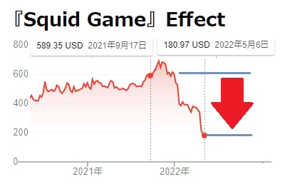 これさ、「イカゲーム」の捏造人気で何億稼いだかしらないけど、Netflix の株式時価総額は、「イカゲーム」配信後8ヵ月で、27兆円くらい減らしてるんだよな。