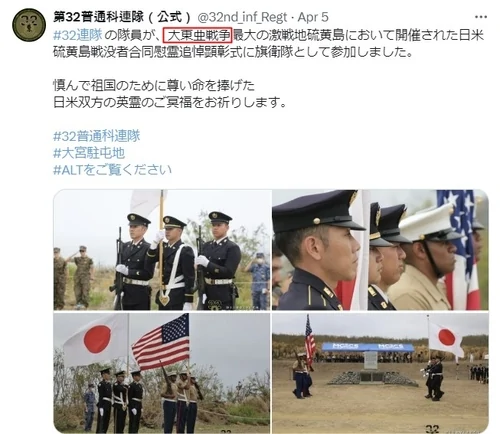 日本陸上自衛隊のある部隊が公式SNSアカウントに侵略戦争である太平洋戦争を美化する用語「大東亜戦争」を使用したことが8日、確認された。