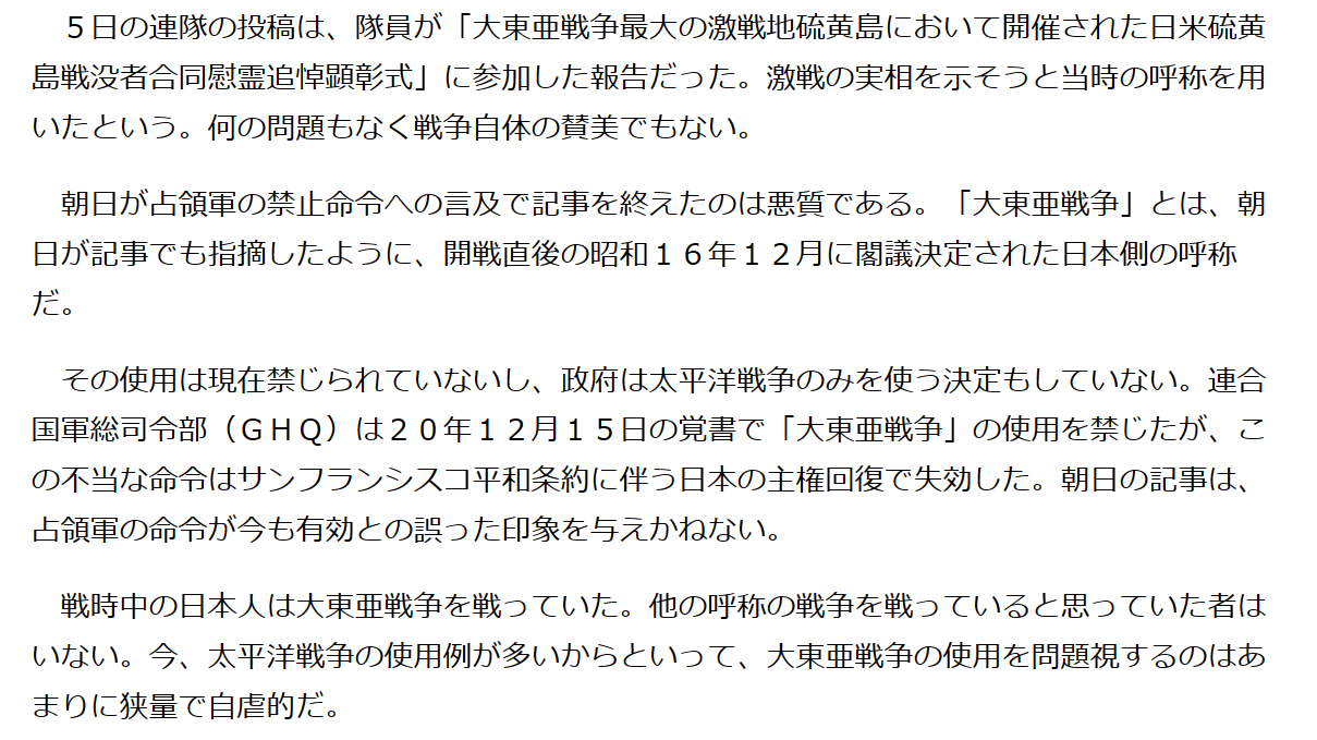 その使用は現在禁じられていないし、政府は太平洋戦争のみを使う決定もしていない。連合国軍総司令部(GHQ)は20年12月15日の覚書で「大東亜戦争」の使用を禁じたが、この不当な命令はサンフランシスコ平和条約に伴う日本の主権回復で失効した。朝日の記事は、占領軍の命令が今も有効との誤った印象を与えかねない。