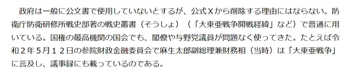 政府は一般に公文書で使用していないとするが、公式Xから削除する理由にはならない。防衛庁防衛研修所戦史部著の戦史叢書(そうしょ)(「大東亜戦争開戦経緯」など)で普通に用いている。国権の最高機関の国会でも、閣僚や与野党議員が問題なく使ってきた。たとえば令和2年5月12日の参院財政金融委員会で麻生太郎副総理兼財務相(当時)は「大東亜戦争」に言及し、議事録にも載っているのである。>>988