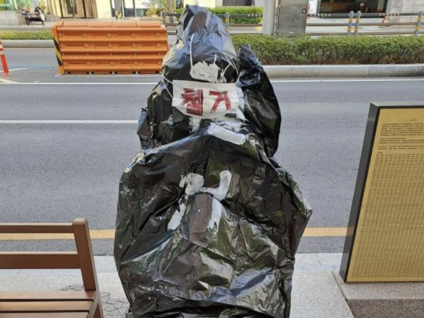 釜山「平和の少女像」に黒い袋テロ…
