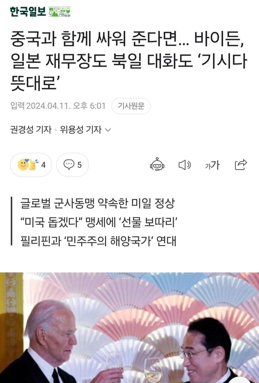 日本の岸田文雄首相は11日(現地時間)、米議会上下院合同演説で「日本は未来のためのグローバルパートナーになる」とし、このように述べた。米日相互指揮統制構造の改善など大々的な同盟アップグレードに合意した日本が、中国牽制を輪にグローバルイシューの前面に出るという意思を強調したのだ。