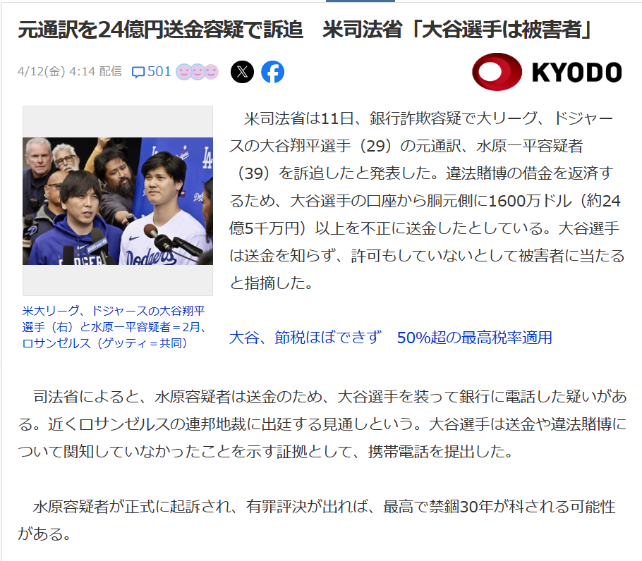 >水原容疑者が大谷氏になりすまして銀行を騙し送金させた!https://news.yahoo.co.jp/articles/319858b77badc3c277a4d4cdd6f370e5fef5dcfc