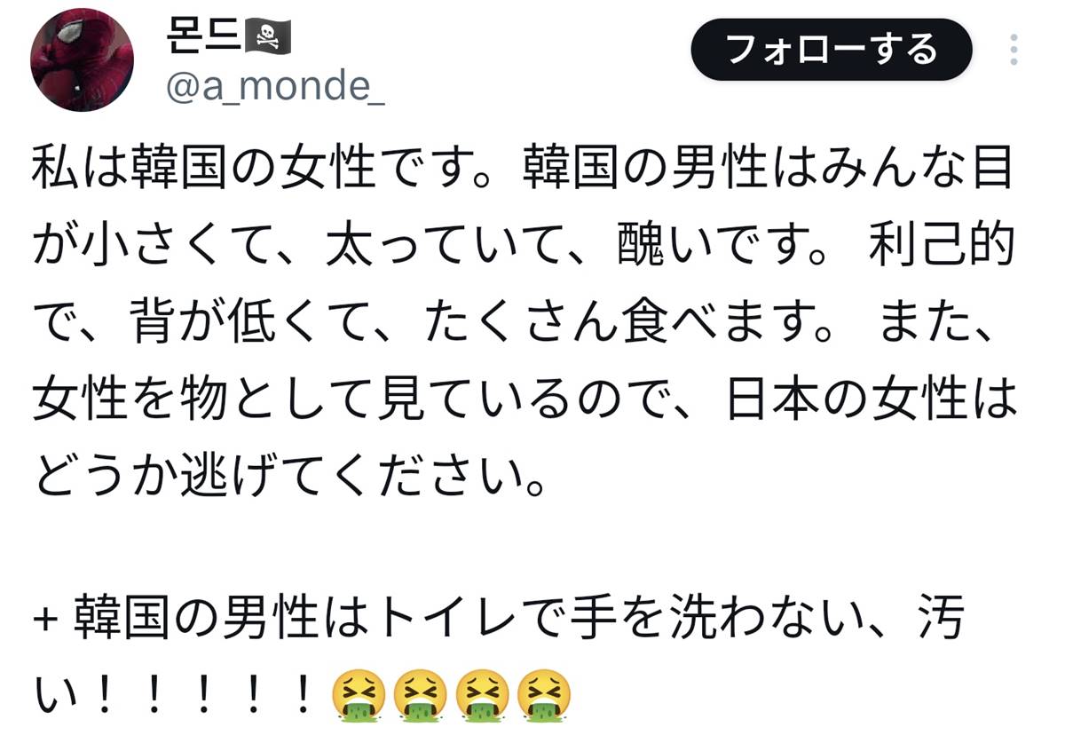 韓国人の皆さん、今後は日本と関わるのをやめ、国交断絶しましょう。韓国人の中では葛藤があるんだろうな。日本が好きな自分がいることが許せないみたいな。在日も同じ。気持ちは北朝鮮、でも心は日本みたいな。だから日本の上空を禿げ鷹のように彷徨うツアーが人気なんだと思う。韓国人はそっちの方がお似合いだよ。