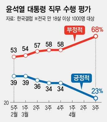 韓国ギャラップは16日から18日にかけて全国の満18歳以上の男女1000人に対して調査を実施し、19日にその結果を発表した。それによると、尹大統領の職務遂行を「支持する」との回答は、直前の調査(3月第4週)から11ポイント下落の23%。「支持しない」は10ポイント上昇の68%で、これも就任以降の最高値だ。中道層の回答者の不支持は71%(支持は19%)に達した。大邱(テグ)・慶尚北道でも不支持は54%で支持(35%)を上回り、釜山(プサン)・蔚山(ウルサン)・慶尚南道でも不支持が61%で支持(28%)の2倍ほど。不支持の理由としては「経済、民生、物価への対応が不十分」(18%)、「コミュニケーションが不十分」(17%)、「独断的、一方的な態度」(10%)などが多かった。