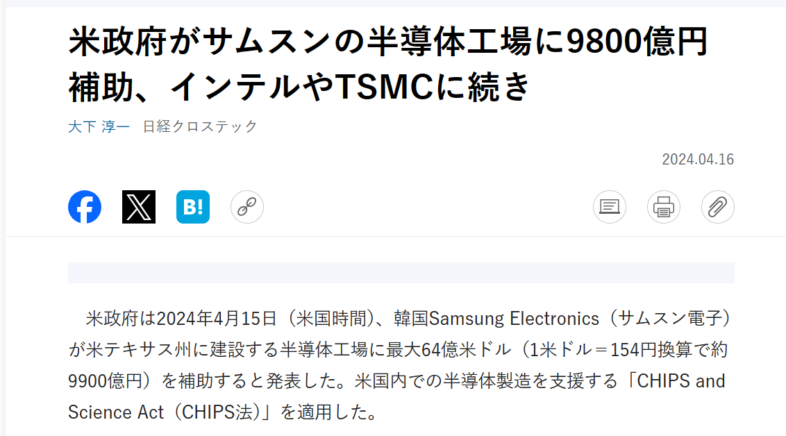 うん、サムスン電子が「アメリカ国内に」投資するからアメリカは補助金を出すんだ。