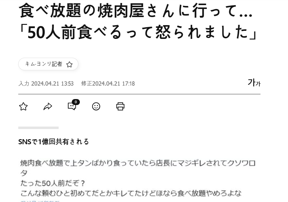 最近、客の日本人ネットユーザーがSNSに写真付きで「焼肉食べ放題で上タンばかり食っていたら店長にマジギレされてクソワロタ」「たった50人前だぞ?」「『こんな頼むひと初めてだ』とかキレてたけど、ほなら食べ放題やめろよな」とアップし、騒ぎになった。