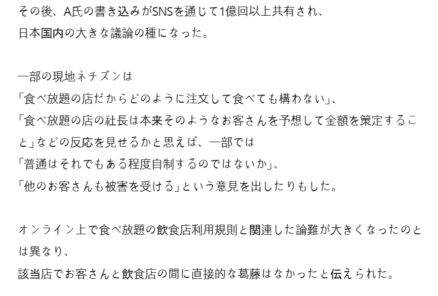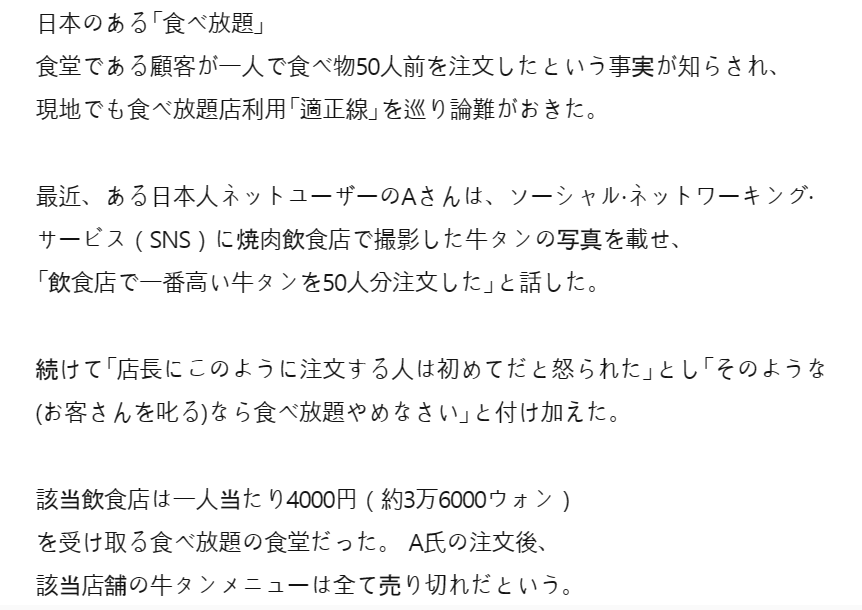 日本のある「食べ放題」食堂である顧客が一人で食べ物50人前を注文したという事実が知らされ、現地でも食べ放題店利用「適正線」を巡り論難がおきた。