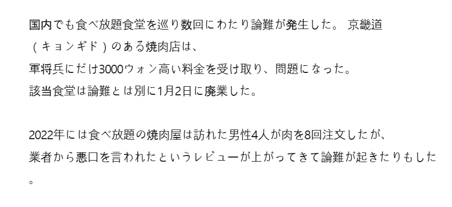 京畿道(キョンギド)の焼き肉店は軍将兵だけ3000ウォン(約330円)高い価格を設定し、問題になった。2022年には食べ放題焼き肉店で男性客4人が肉を8回注文したことで店側から悪口を言われたというレビューが上がり、騒ぎになった。