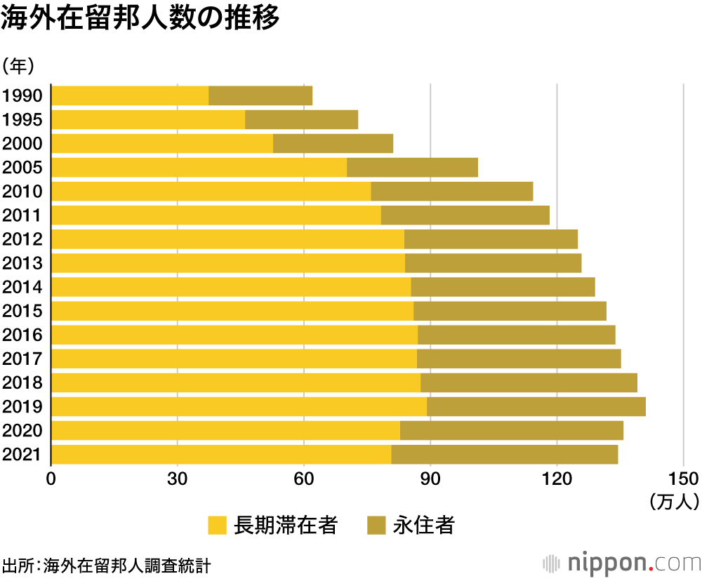 海外で暮らす日本人の合計は約130万9千人で、長期滞在者と永住者からなる。>>1