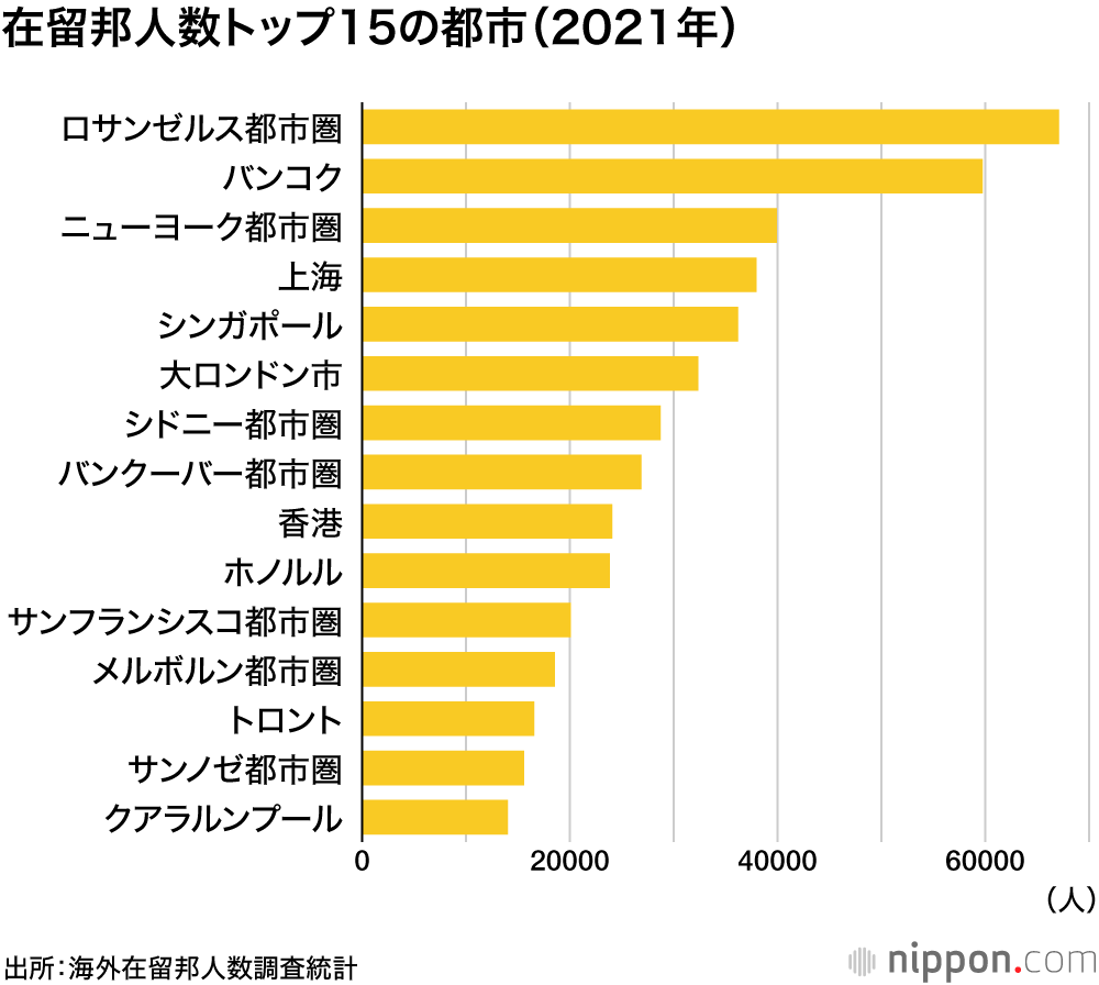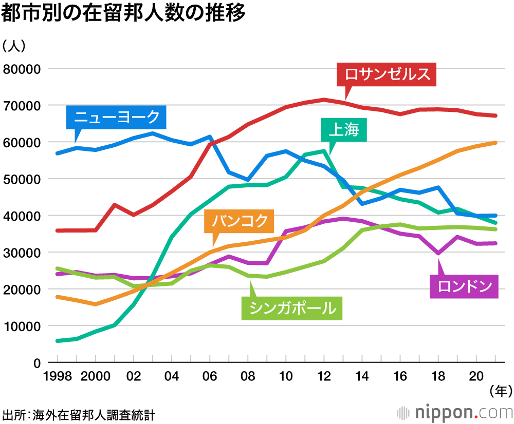 都市別の在留邦人数トップはロサンゼルス都市圏(米国)の6万7000人。次いでバンコク(タイ)5万9000人、ニューヨーク都市圏(米国)3万9000人、上海(中国)3万7000人、シンガポール3万6000人、大ロンドン都市圏(英国)3万2000人と続く。10年前の11年と比べると、バンコクが2万人以上増加した一方、上海は1万9000人、ニューヨークは1万5000人もそれぞれ減少している。