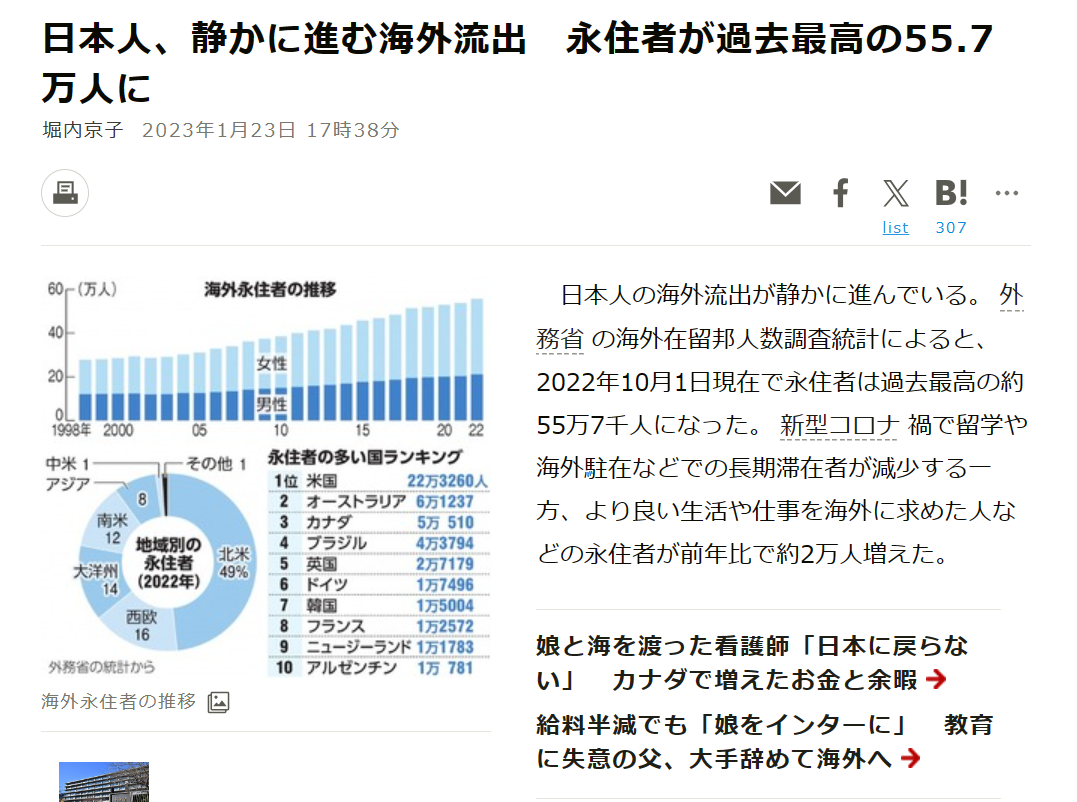 日経は「海外移民の背景として社会保障改革や性平等が改善されない日本で暮らすことが長期的に不安なためだという分析が出ている」と指摘した。朝日・毎日・日経などの極左メディアの偏向報道に朝鮮メディアが全力で乗っかったいつものパターン