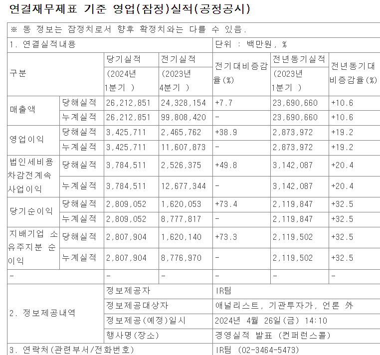現代モービスは26日、2024年第1四半期の営業利益が前年同期比29.8%増の5427億ウォンと暫定集計されたと公示した。 当期純利益は8624億ウォンで2.4%増えた。