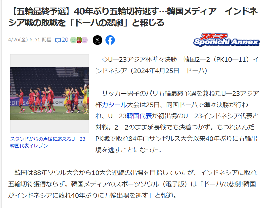 韓国は88年ソウル大会から10大会連続の出場を目指していたが、インドネシアに敗れ五輪切符獲得ならず。韓国メディアのスポーツソウル(電子版)は「ドーハの悲劇!韓国がインドネシアに敗れ40年ぶりに五輪出場を逃す」と報道。