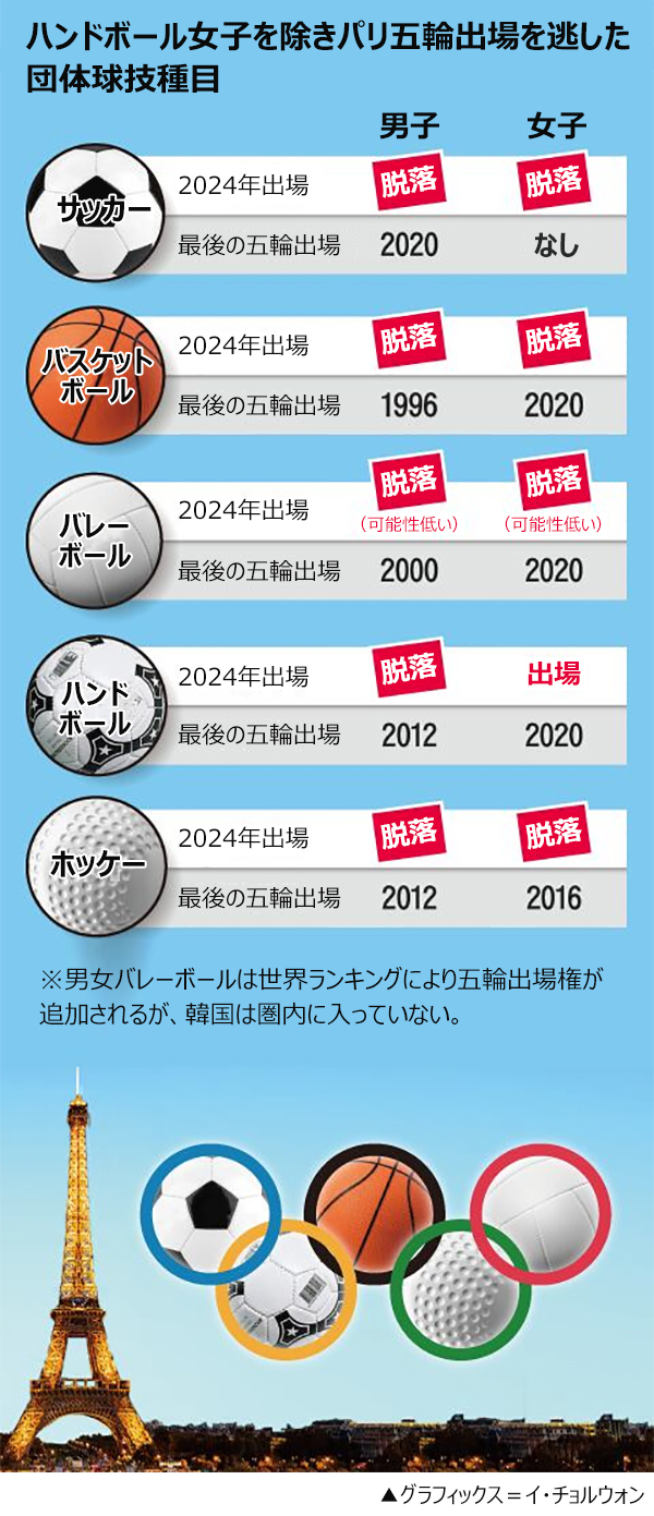 韓国は1988年ソウル五輪から2020年(2021年開催)東京まで、4種目から7種目にわたる団体球技に出場してきた。ハンドボール男子・女子は五輪で通算金2個、銀4個、銅1個(歴代総合5位)と活躍した。ホッケー男子・女子(銀3個)、バスケットボール女子(銀1個)、バレーボール女子(銅1個)、サッカー男子(銅1個)も五輪出場が多かった。ところが、2016年リオデジャネイロ五輪には団体球技4種目、前回の東京五輪には6種目で出場しながら、2大会連続でメダルなしで終わった。そして今やメダルどころか、五輪に出場することすら難しくなってしまった。