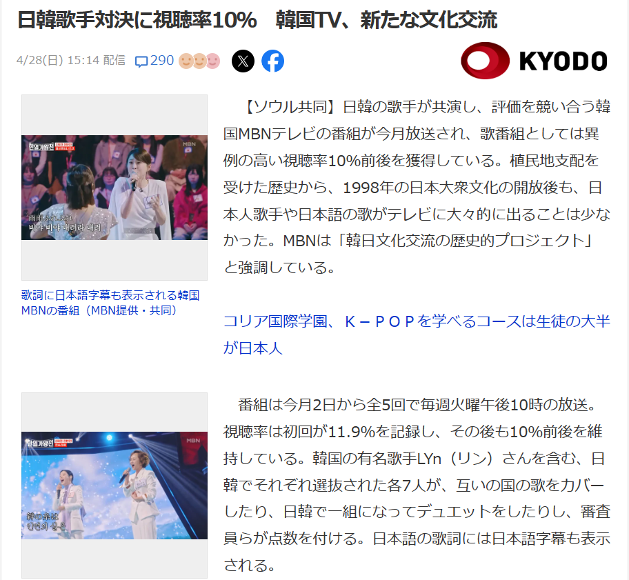 ただ、KPOPビジネスが詐欺集団だから、KPOP好きな奴らが、その悪影響を周りに及ぼすのが迷惑だ、と思っているだけで。MBNの『日韓歌王戦』で、日本語歌唱自主規制が解かれた影響は大きかった。