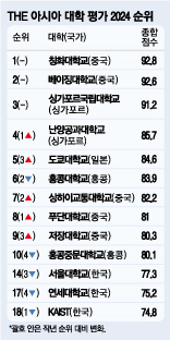今年、英国大学評価機関タイムズ高等教育(THE)のアジア大学評価で韓国最上位大学の順位が一斉に落ちた。 一方、中国と日本の大学は躍進した。 韓国は特に研究と教育部門で遅れた。