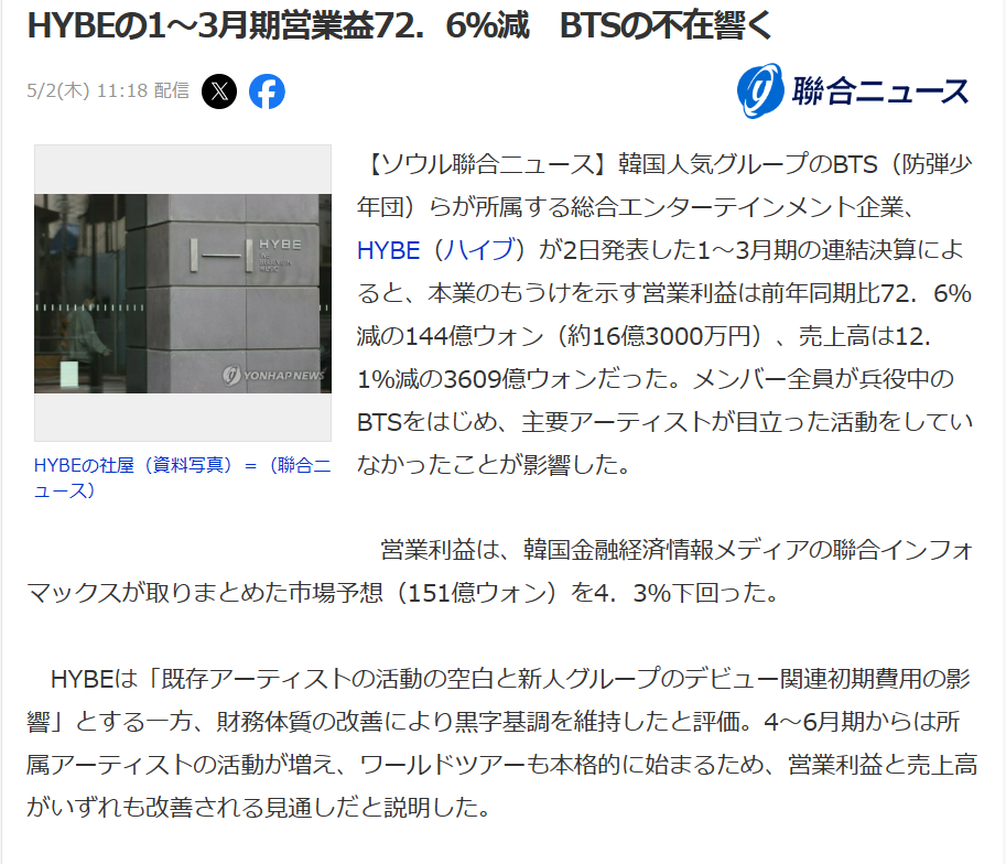 HYBEの1~3月期営業益72.6%減 BTSの不在響く